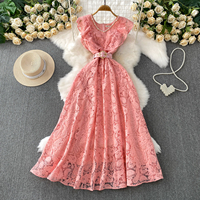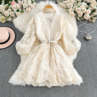 YM0142フランスのエレガントなレースドレスシングルブレストウエストVネックランタンスリーブレディースドレス